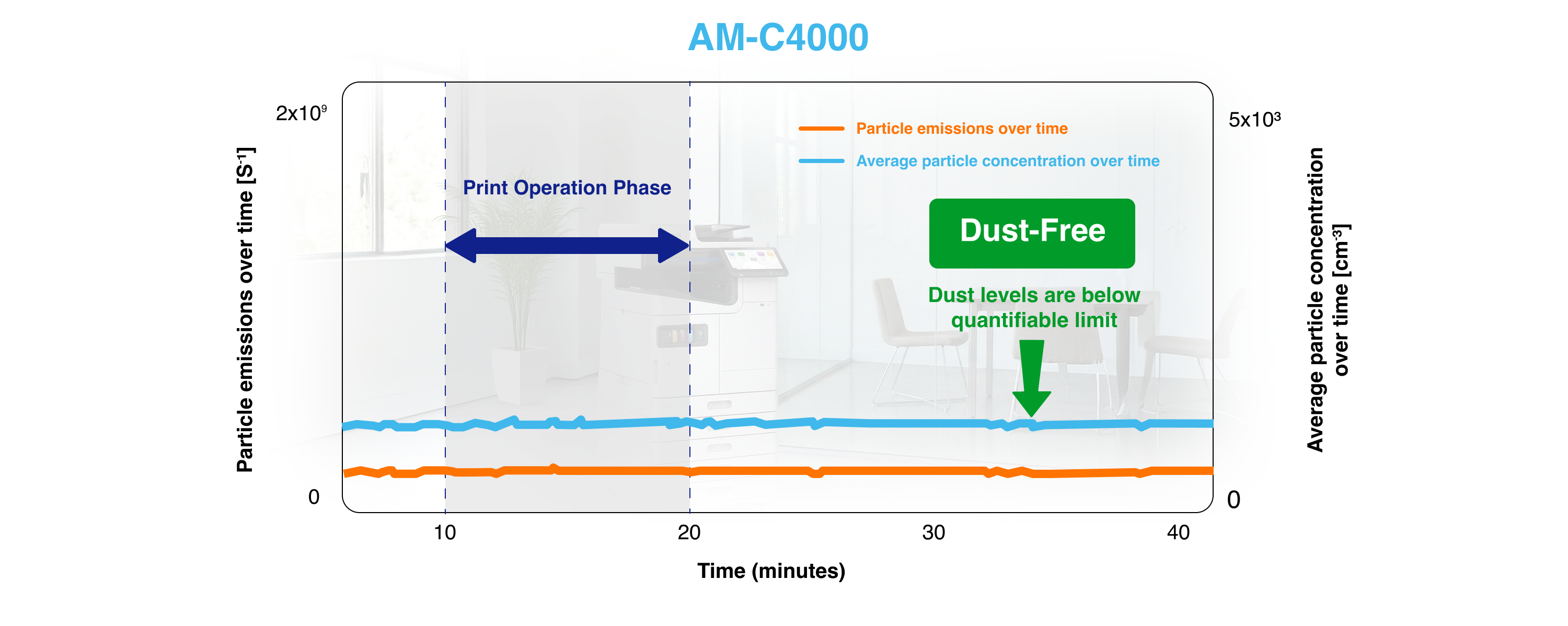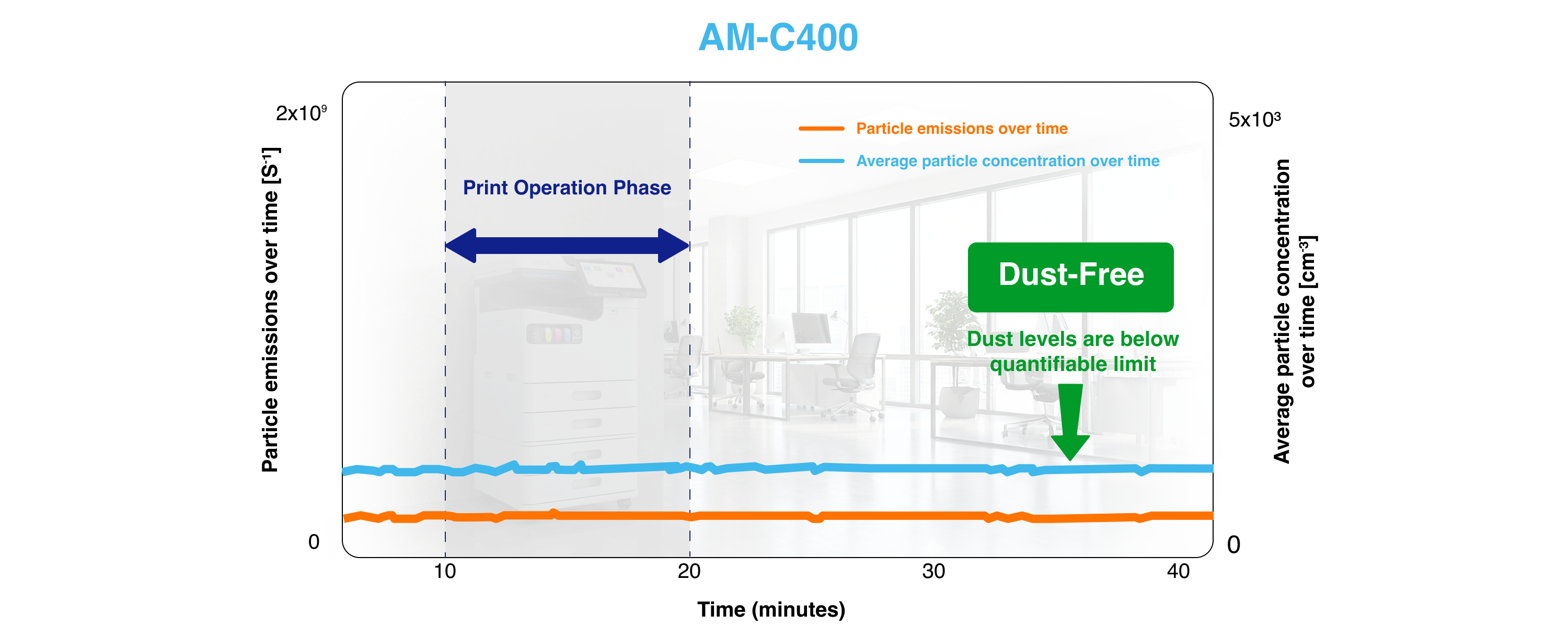 • No detectable fine/ultrafine dust generated from the printer during operation: ΔCP ≤ 1000 cm⁻³ (ΔCP: difference in total particle number concentration at the start/end of operation.)