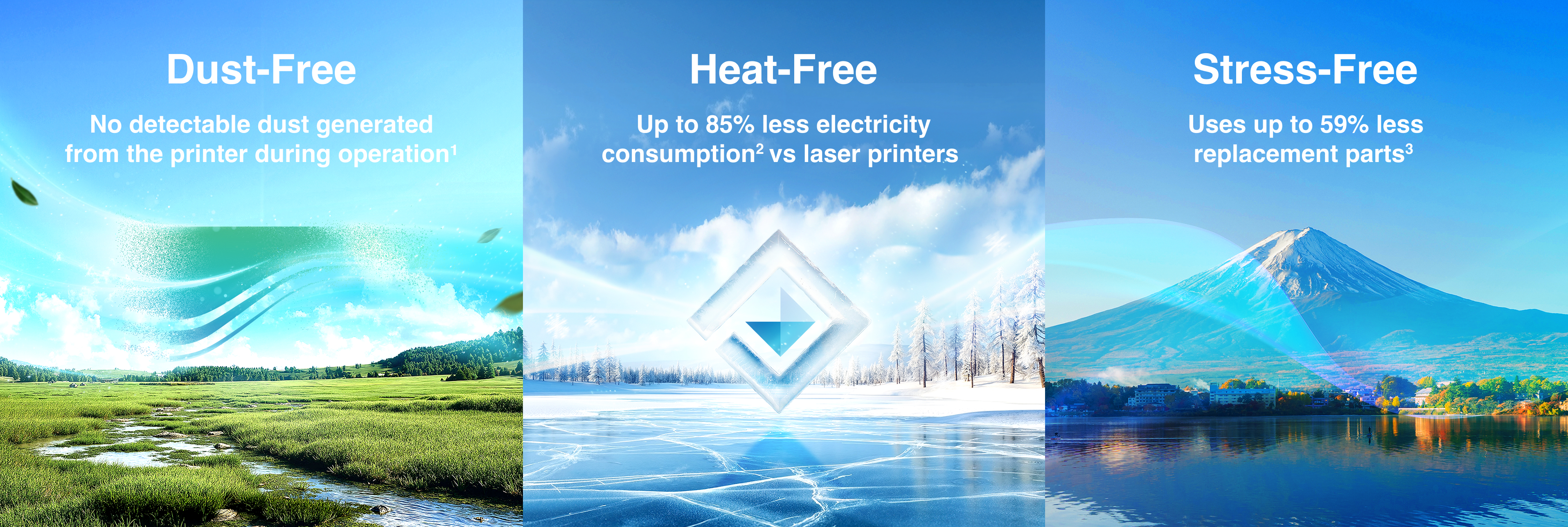 Epson inkjet redefines printing for today’s workplaces. Powered by three key innovations – Dust-Free1, Heat-Free2, and Stress-Free3 – Epson delivers printing designed to help reduce electricity use, with reliable and responsible printing experiences for productive environments across a wide range of industries.